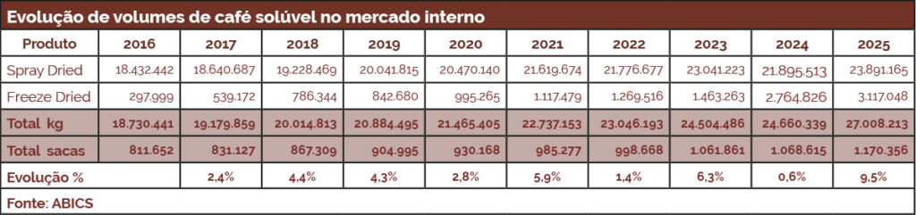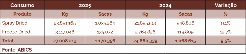 Em contraste com o volume exportado, o consumo interno de café solúvel alcançou um novo recorde no ano passado, quando o Brasil absorveu 27,008 mil toneladas, equivalentes a 1,170 milhão de sacas, montante que representa crescimento de 9,5% na comparação com 2024.