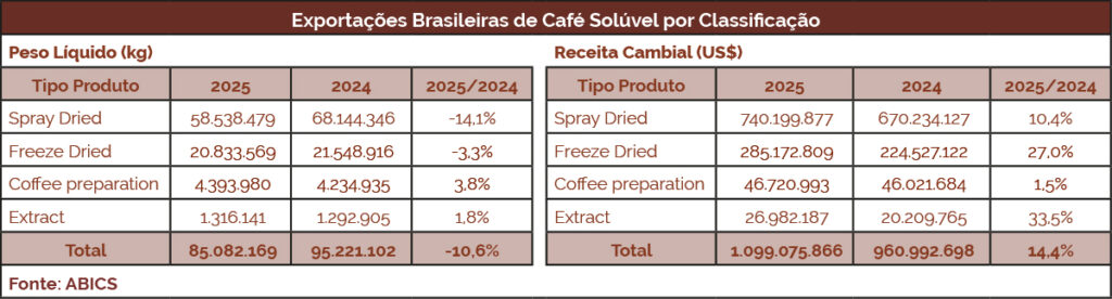Por outro lado, as divisas geradas com os embarques atingiram um crescimento de 14,4% ante 2024, chegando ao recorde de US$ 1,099 bilhão. “Atribui-se esse aumento no valor, apesar da queda no volume, à valorização da cotação da matéria prima, tanto dos cafés arábicas, quanto dos canéforas (conilon e robusta), o que elevou o preço do solúvel no mercado”, explica Aguinaldo Lima, diretor executivo da ABICS.